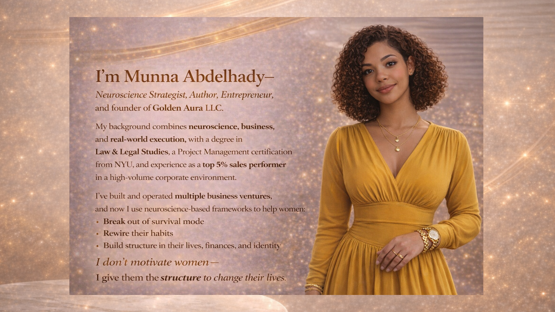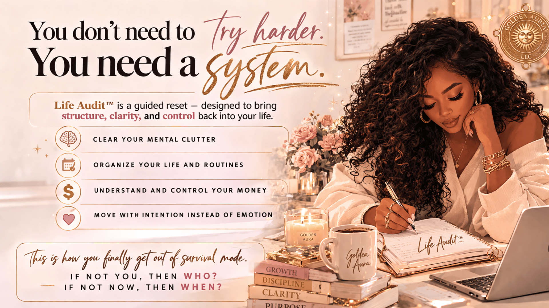Golden Aura LLC helps individuals and entrepreneurs create clarity through structured self-evaluation, life systems, and foundational business education.